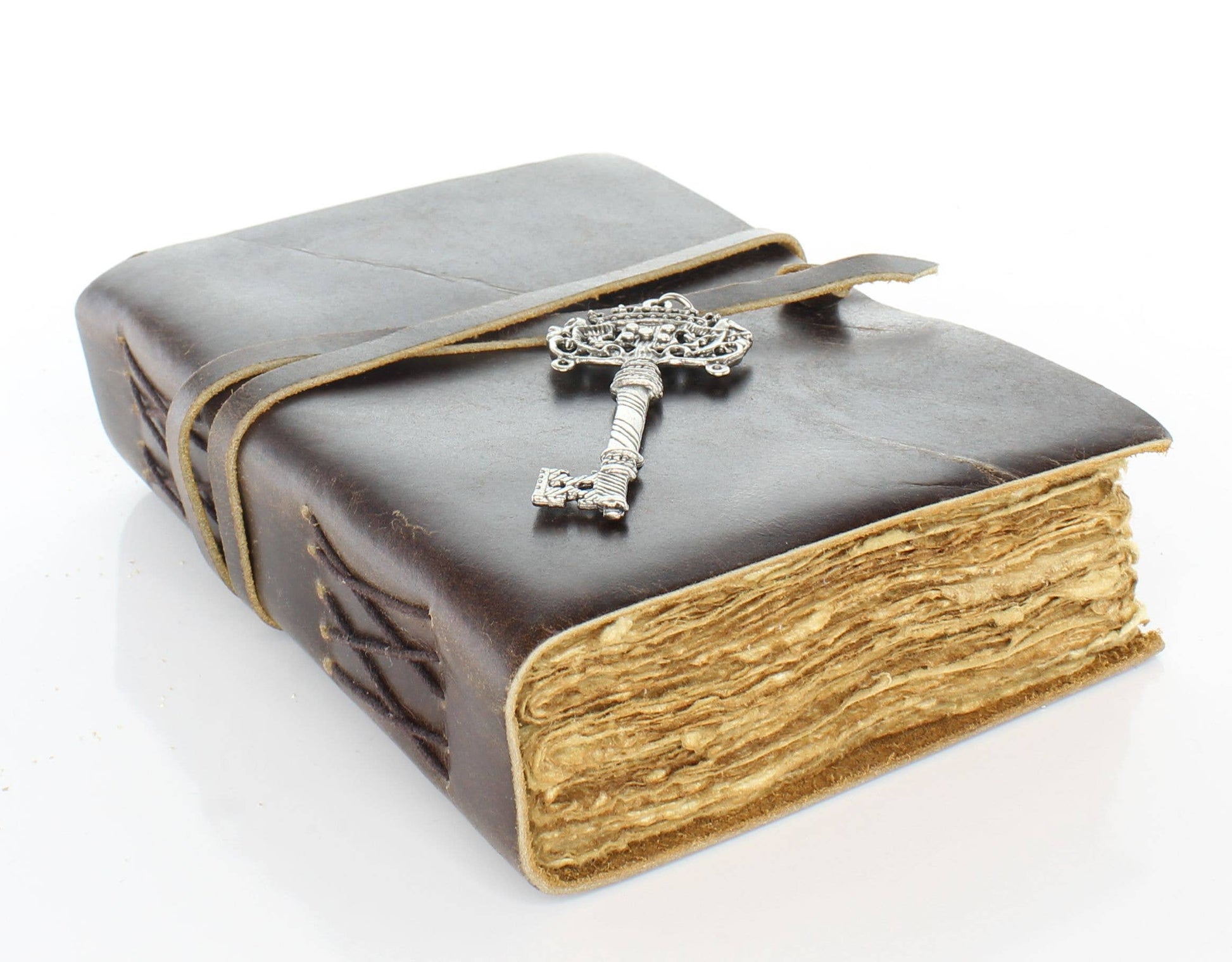 This exquisite antique leather journal features a supple, weathered cover, closed with a traditional string tie. Attached to the string is a charming silver key pendant, adding a touch of mystery and elegance. Inside, the journal is filled with rich parchment paper, perfect for capturing timeless thoughts and memories. This beautiful piece blends old world craftsmanship with a sense of intrigue, making it an ideal keepsake or gift